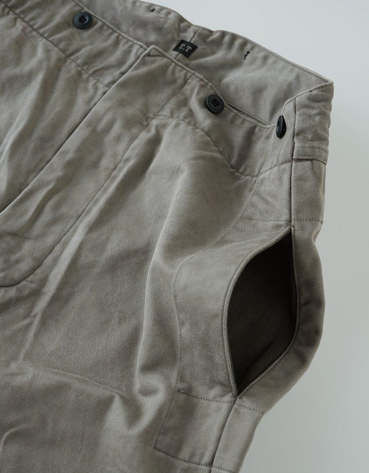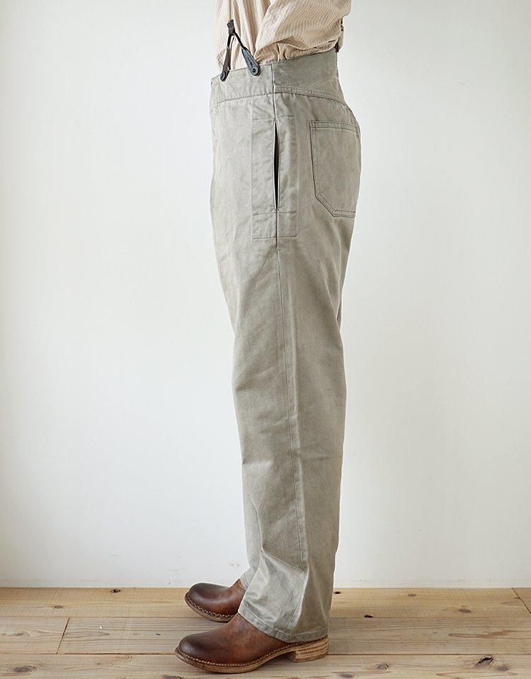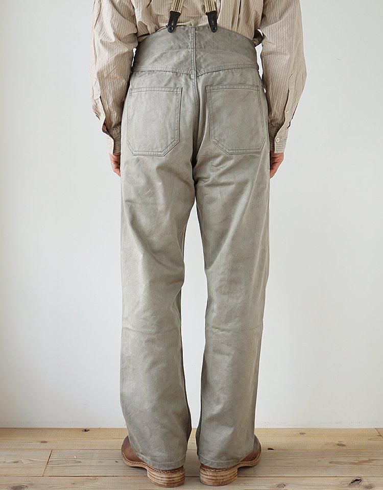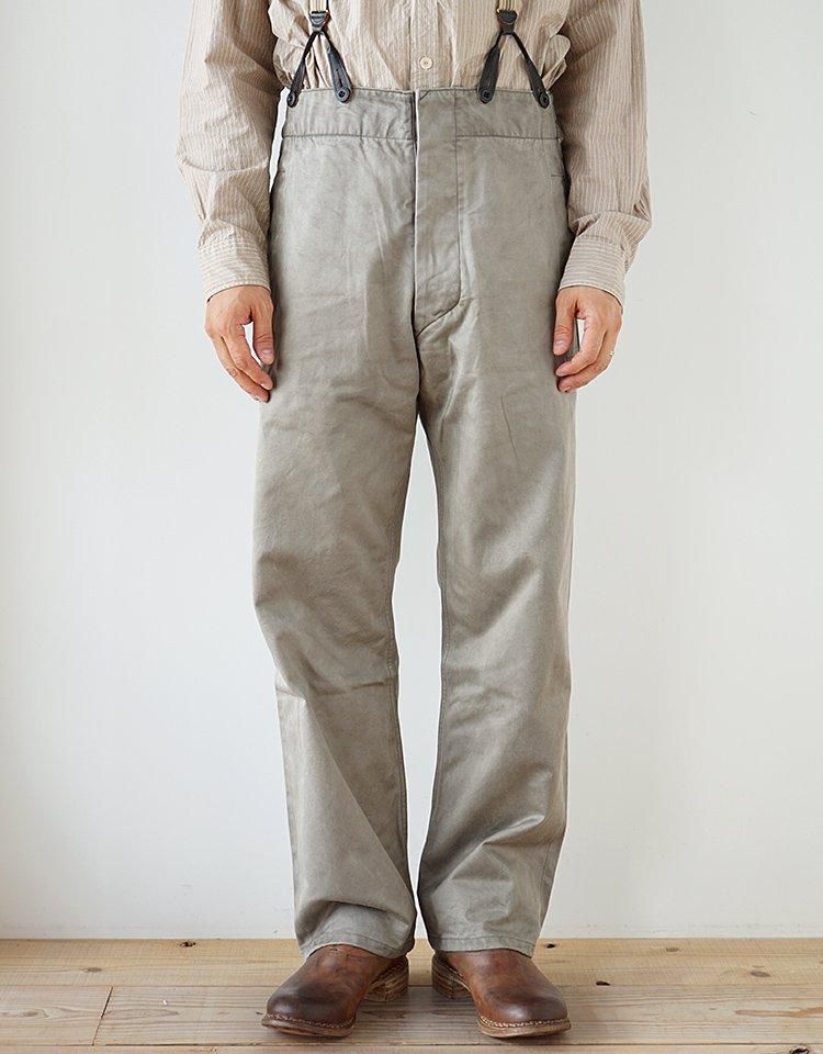 当時のパンツはオーバーオールをベースとしたデザインが多く、平面的なシルエットでサスペンダーで着用されていた。