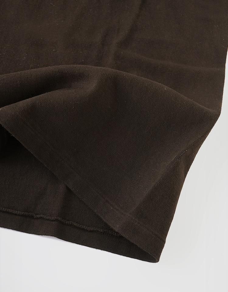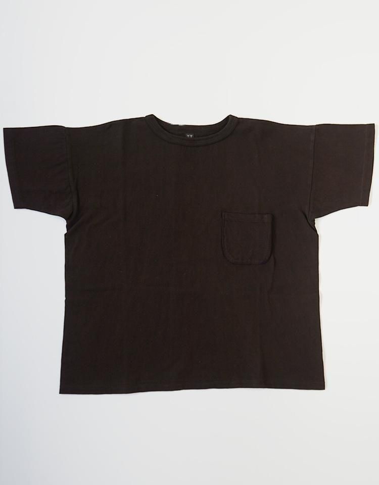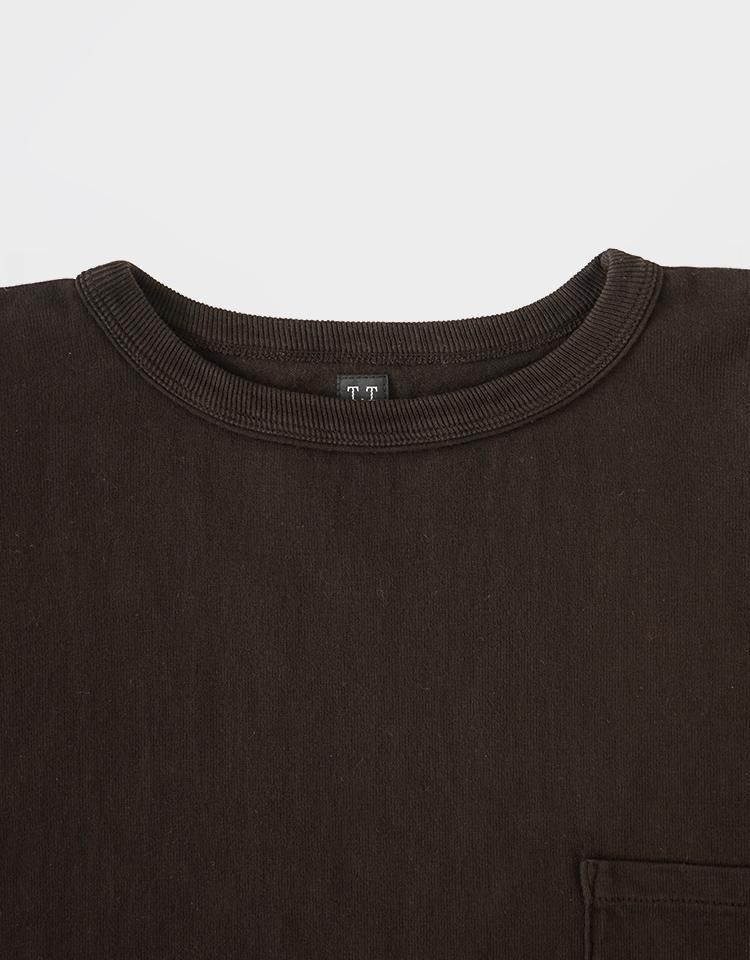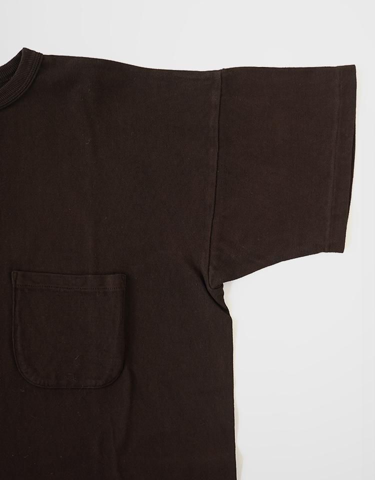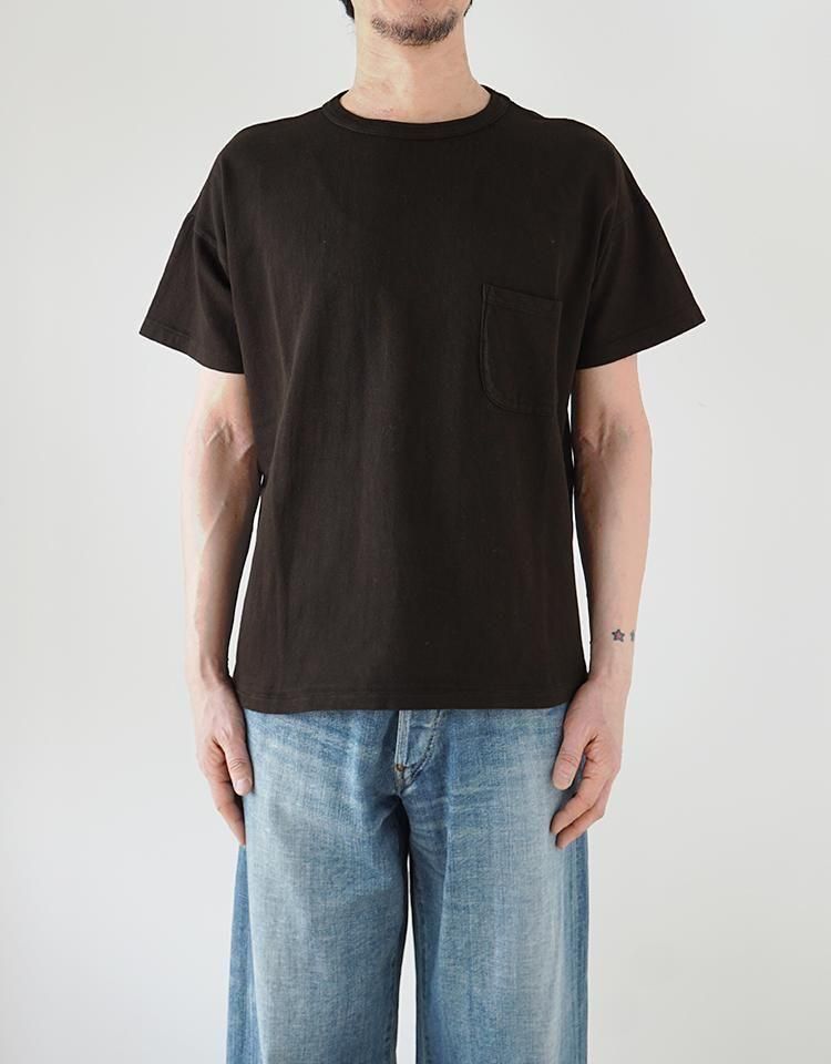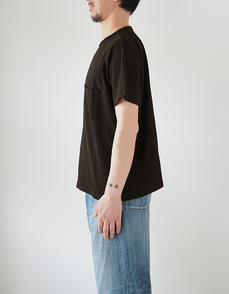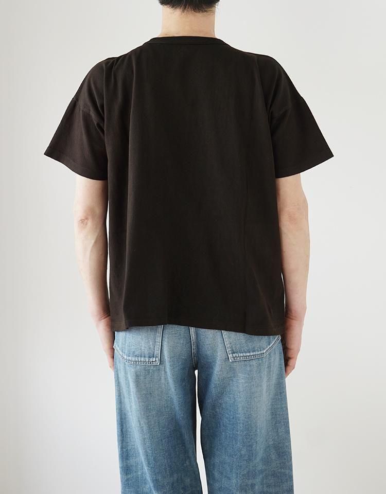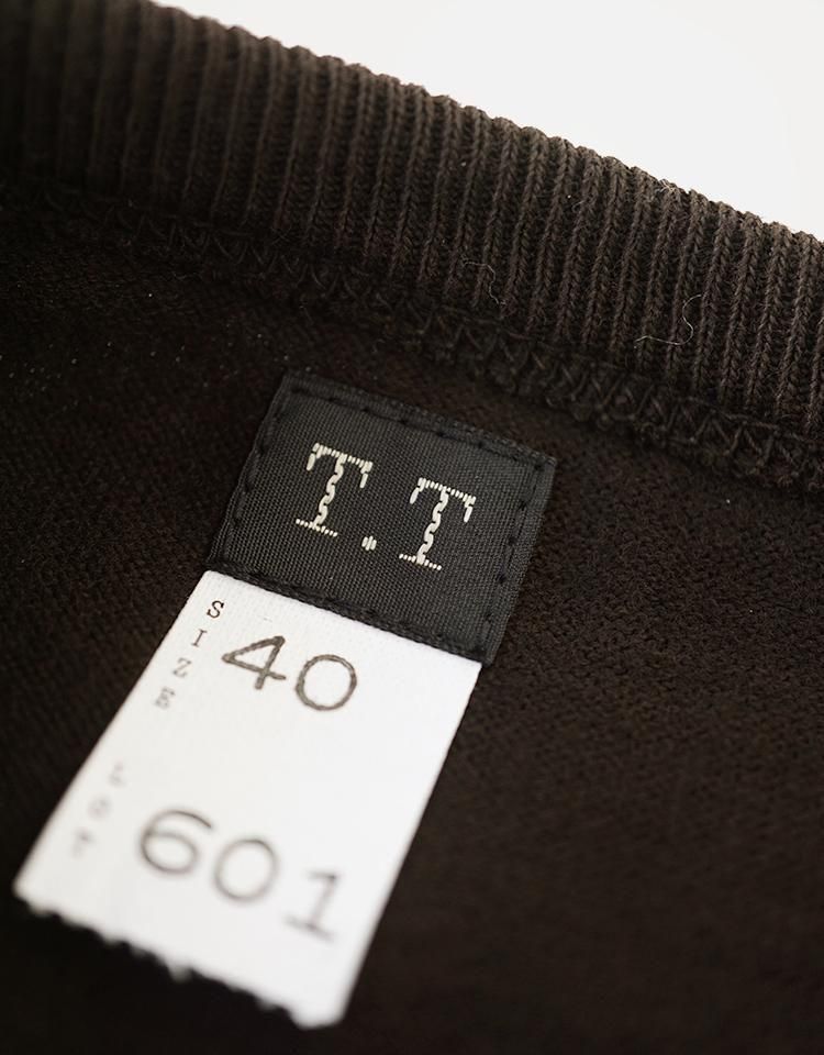 肩傾斜が無く、ボートネックの様な首元、伸び止めのために2重になっているネックリブなどヴィンテージの設計を抽出したデザイン。