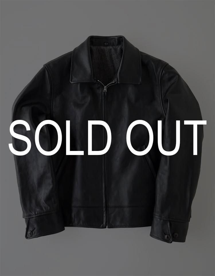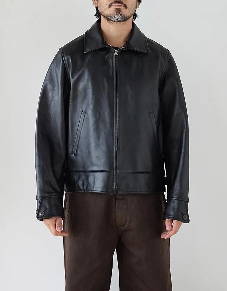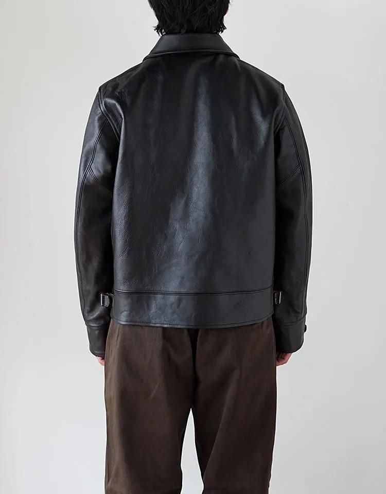 ニューヨークで見つけたアメリカ製で1930 年代のレザージャケットがベース。前に振った袖やアームホールなど、まだ馬に乗っていた時代の名残を感じさせる美しいシルエットを盛り込んでいる。アールデコ調の刻印が入った扇型のジッパーやベークライトボタンなどはオリジナルで作成した。