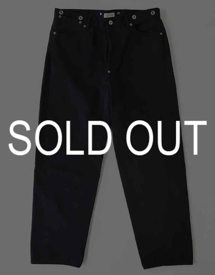 1960年代のデニム素材を研究しリプロダクトした14デニム生地を使用したカーペンターパンツ。ヴィンテージジーンズの特徴でもある捻れからインスピレーションを受け、左右のパターン構成を調整しアメリカンワークにはないシルエットを構築したデザイン。生地はオーバーダイを施し、1960年代デニムの歴史でもある黒インディゴ仕上げです。使い込むと黒色が落ちて中からインディゴカラーが覗くよう設計されています。ヴィンテージ感を表現するために仕上げ後の毛焼き・スキュー加工無しで作り上げられているところも、こだわりの手法となっています。