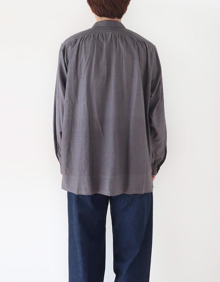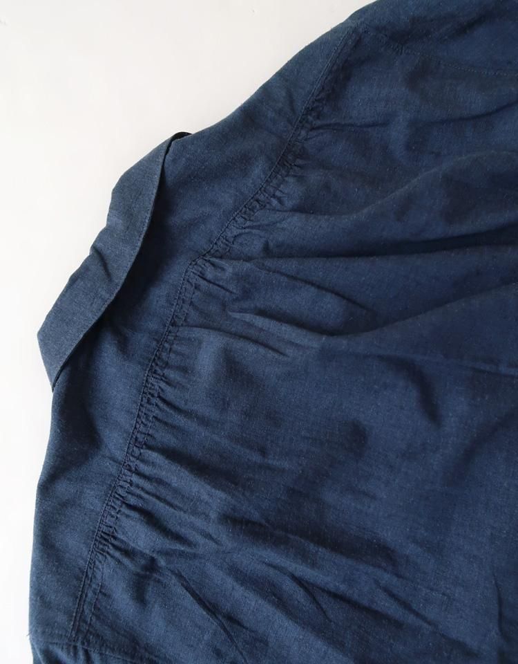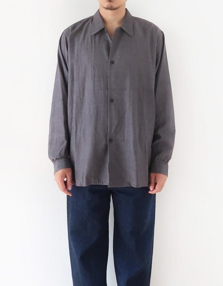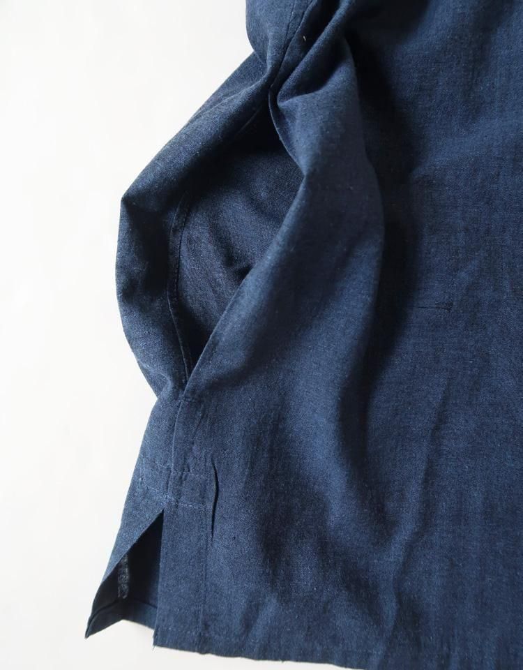 カディコットンとシルクで構成されたシャンブレ生地を使用したオープンカラージャケットシャツ。ジャケットとシャツの中間のようなデザインで、インドならではの手仕事と緻密な設計により多様なシーンで着用できる仕上がりです。生地は1920〜1930年代の通称ゴマシャンを目指して制作。細部にチェーンステッチを手作業にてギャザーをつまみながら入れる仕様など、縫製面でも手作業を駆使し立体的に仕立てています。