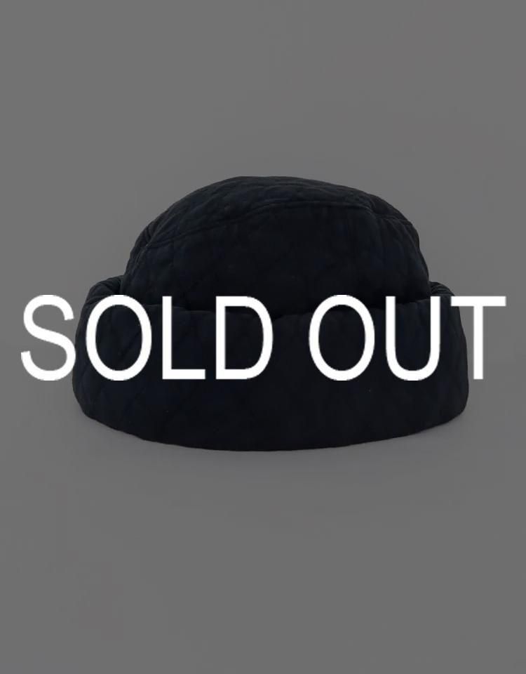 コットンジャージーキルティング生地のギャリソンキャップ。キルティング生地はシンサレートのパデッド仕様、硫化染め、ヴィンテージ加工を施した表情も特徴です。駐屯地で被られた制帽がモチーフで、ブリムがないため、室内でも違和感なく被れるデザインです。折り返し部分を伸ばしても着用が可能です。