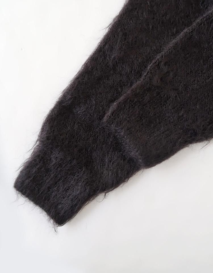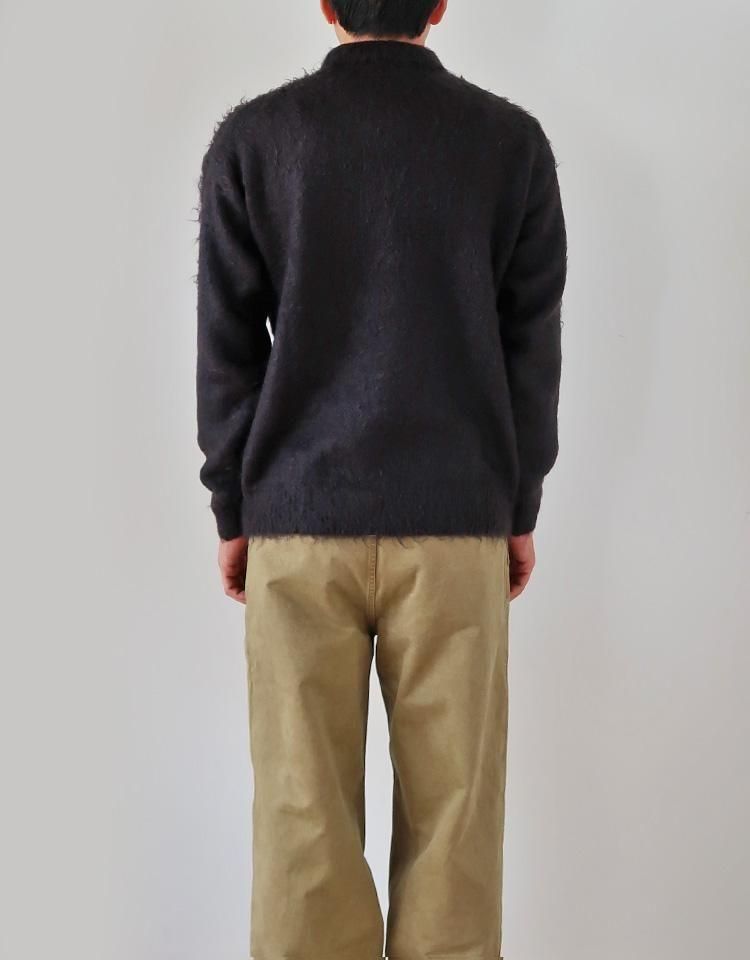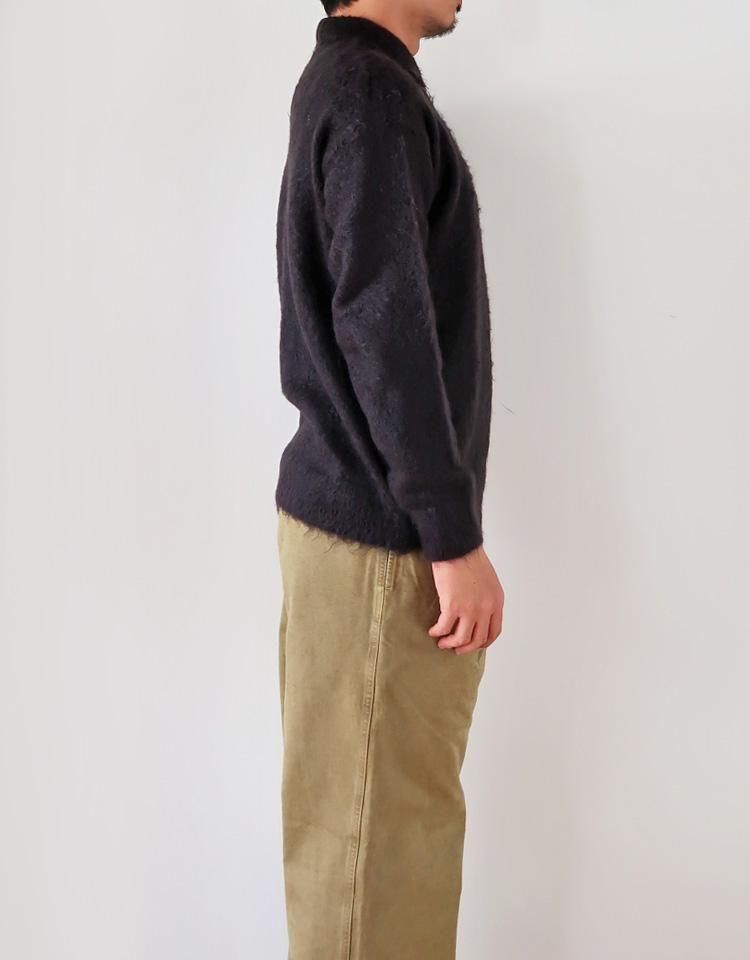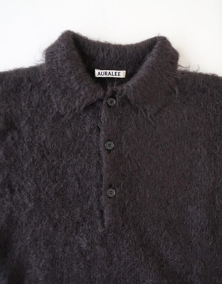 AURALEE定番である上質のモヘヤを使用したポロニット。南アフリカ産の特に柔らかなスーパーキッドモヘヤを甘撚りに紡績し、芯糸に柔らかい天然繊維のウールを使用した糸にて編み上げたこのニットは、軽くて滑らかな肌触りがよく、モヘヤ特有の光沢感とボリュームのある毛足の長さが特徴です。