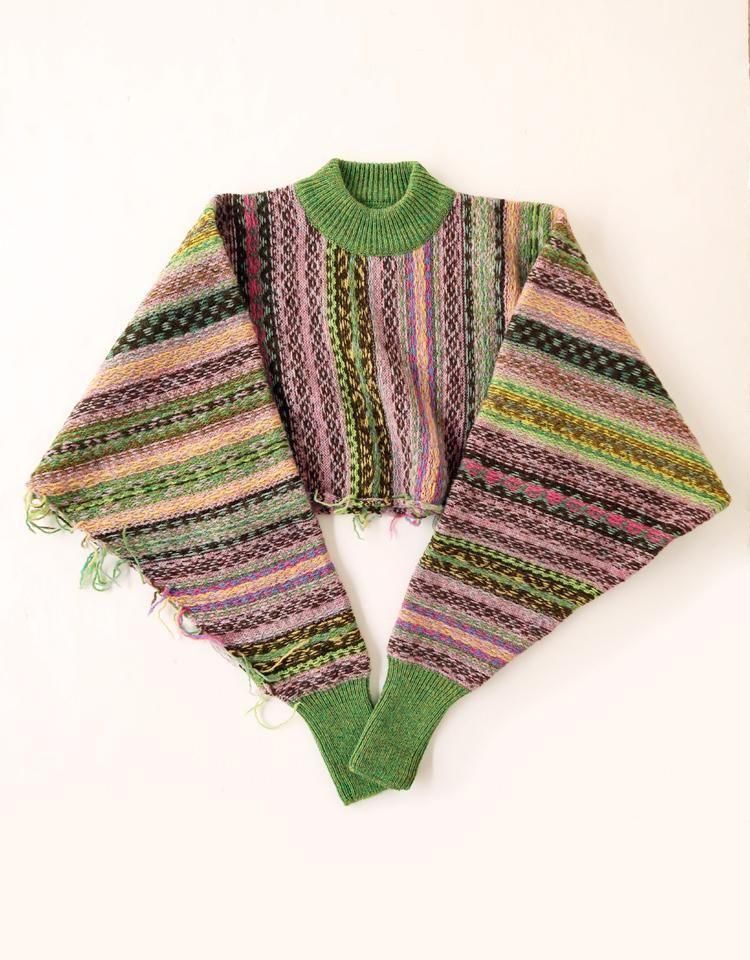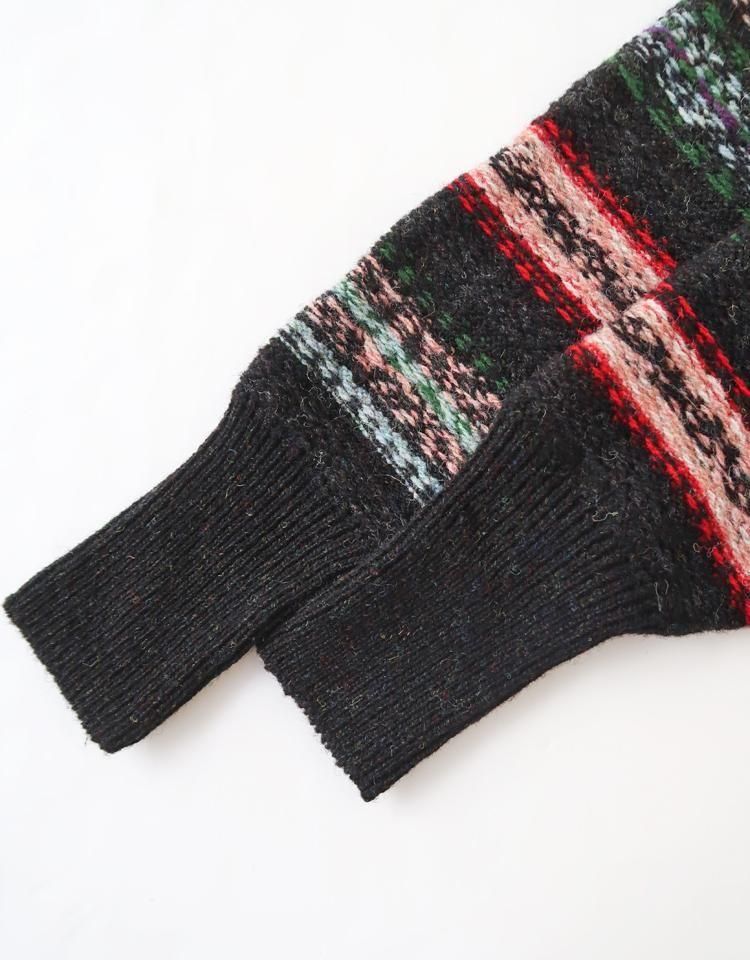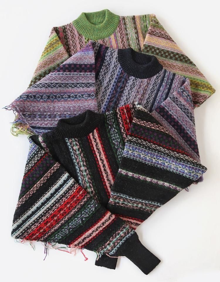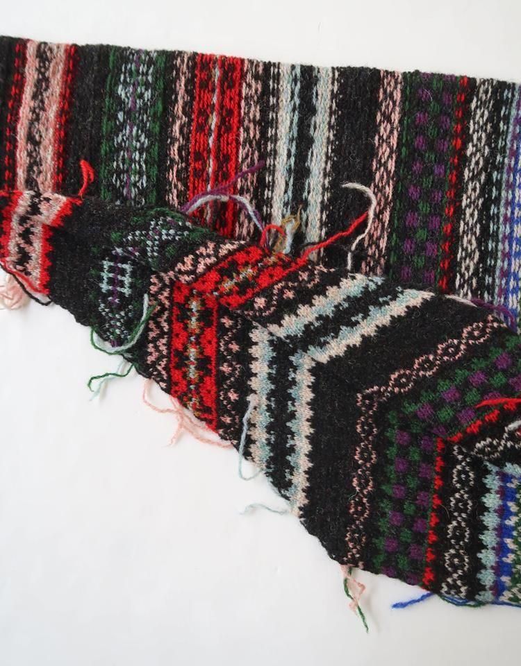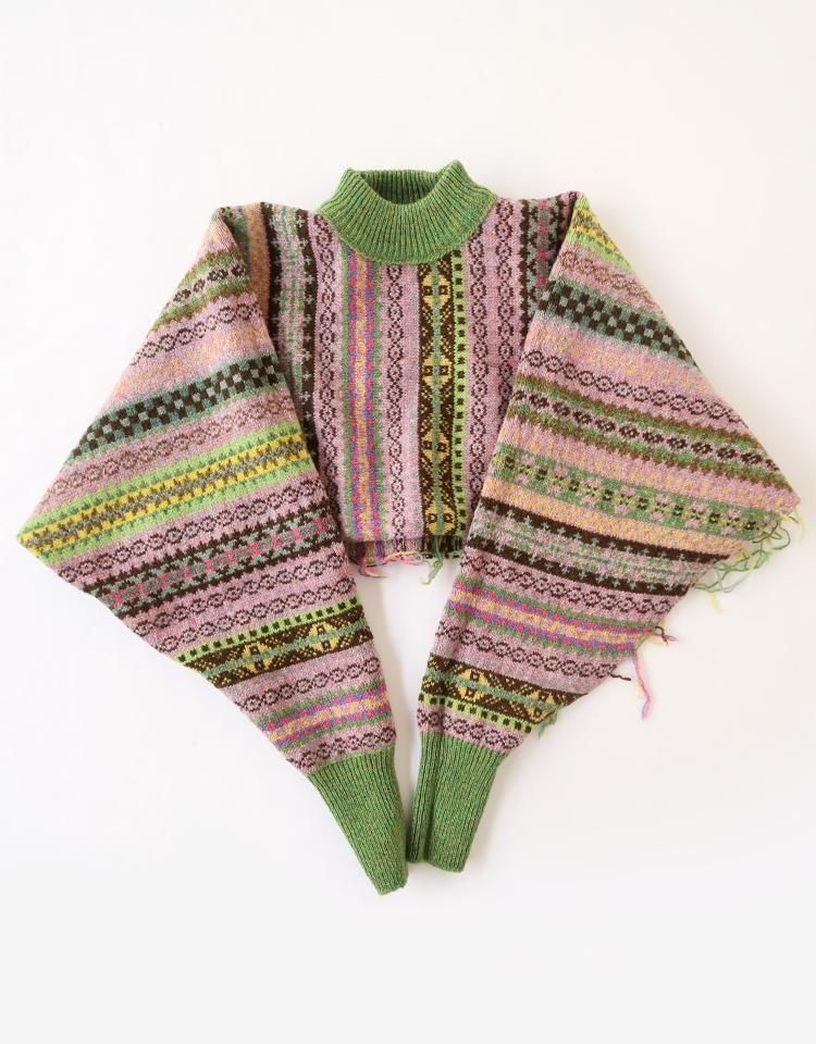 フェアアイルニットで有名なスコットランド【Jamieson’s】とのコラボレーションニット。普通に着るとクロップドセーター、片方の袖下が閉じていないので袖を首に巻くとマフラーのようになり、またそこの裏側の編み地が見えるというデザインになっています。フェアアイルニットの表裏どちらも柄や色が素敵に見える特性をいかしてリバーシブル仕様になっています。