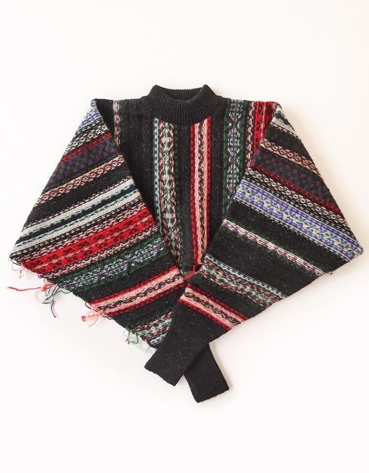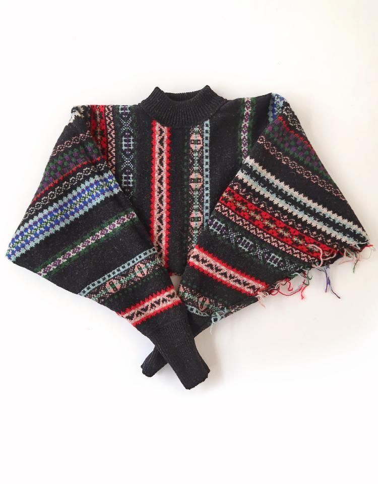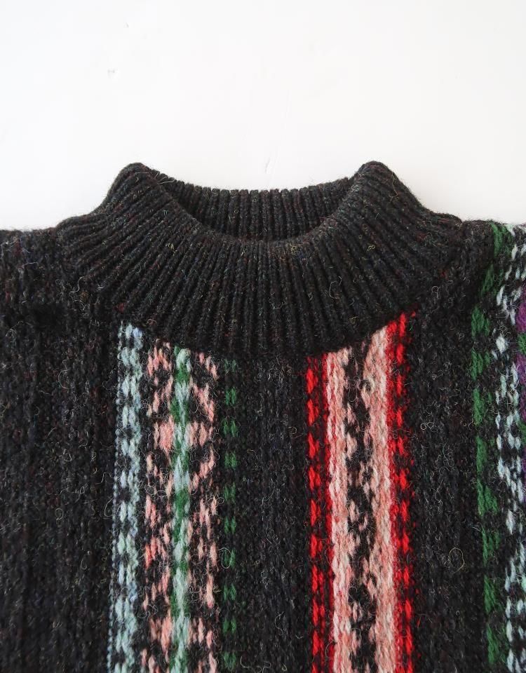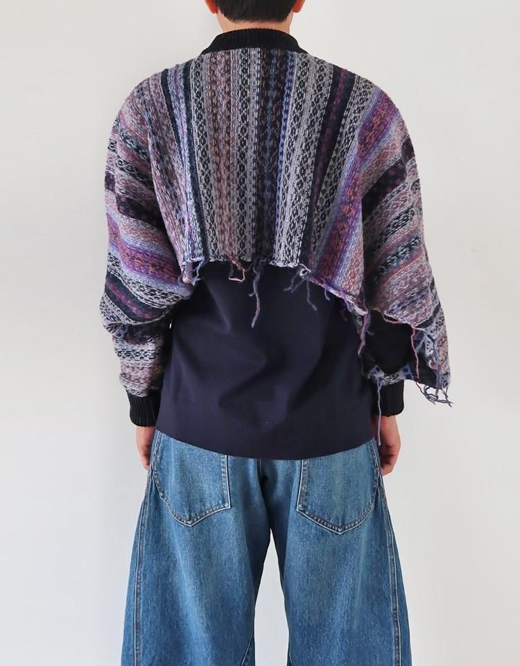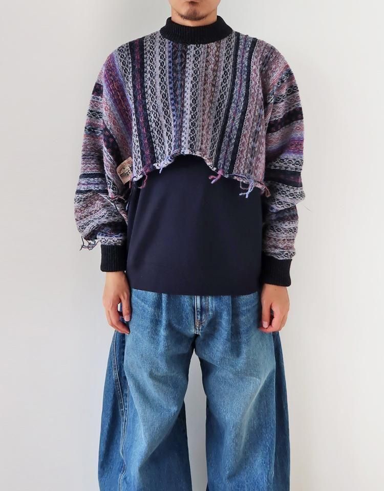 フェアアイルニットで有名なスコットランド【Jamieson’s】とのコラボレーションニット。普通に着るとクロップドセーター、片方の袖下が閉じていないので袖を首に巻くとマフラーのようになり、またそこの裏側の編み地が見えるというデザインになっています。フェアアイルニットの表裏どちらも柄や色が素敵に見える特性をいかしてリバーシブル仕様になっています。