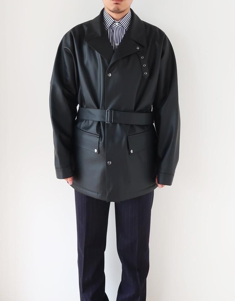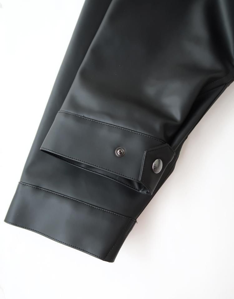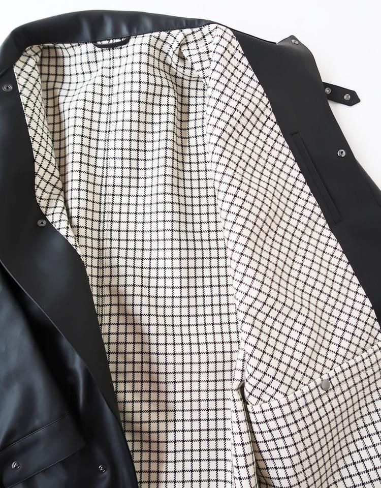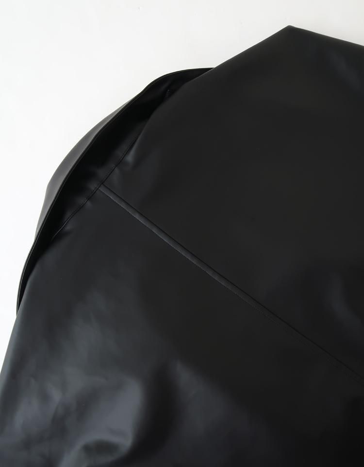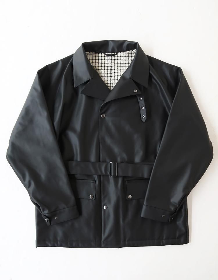 国内素材、⼩松マテーレのエクスクルーシブ素材ラバー⾒えのラミネート素材使⽤。1940年代のイギリスのモータサイクルブルゾンをインスピレーションにブルゾンを製作。