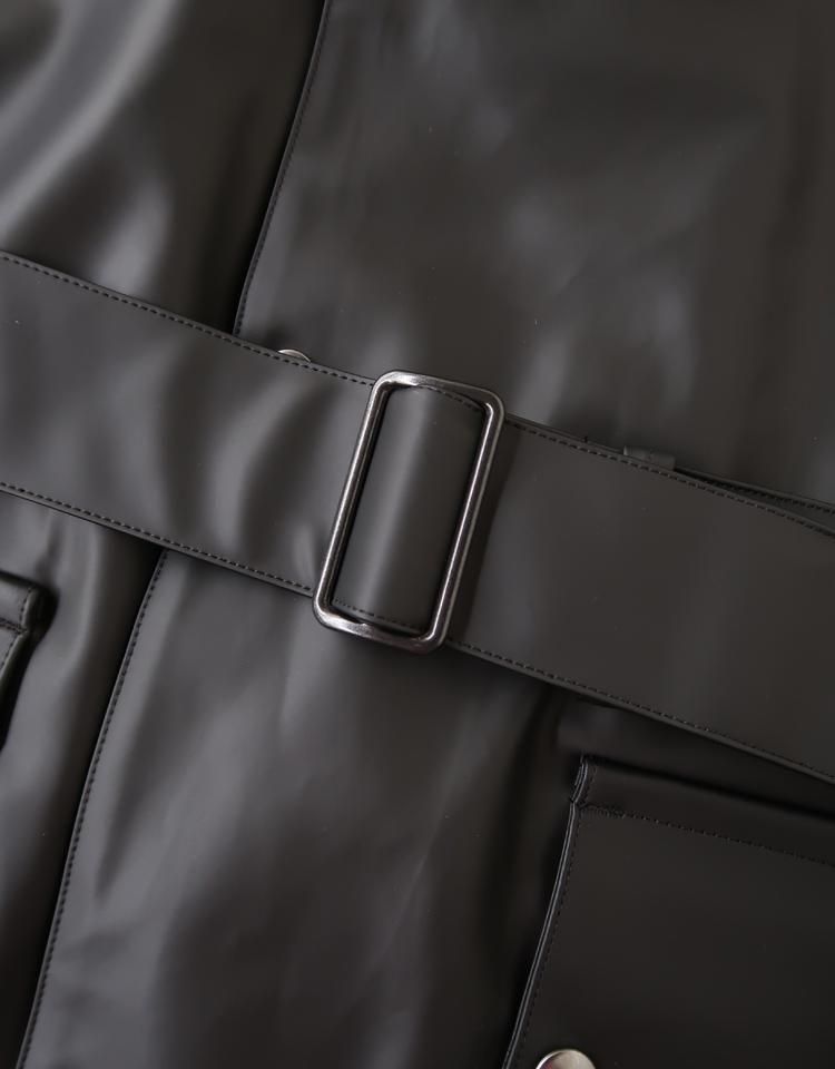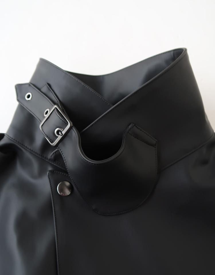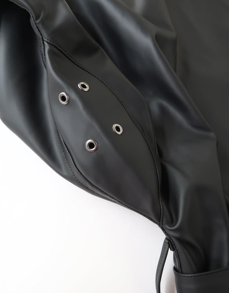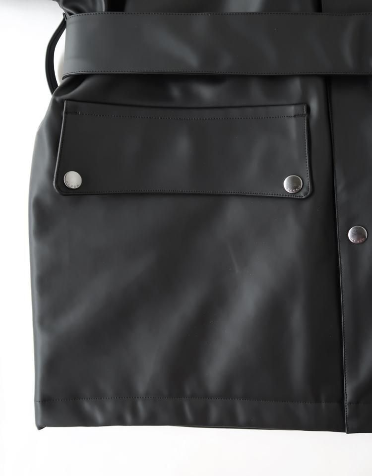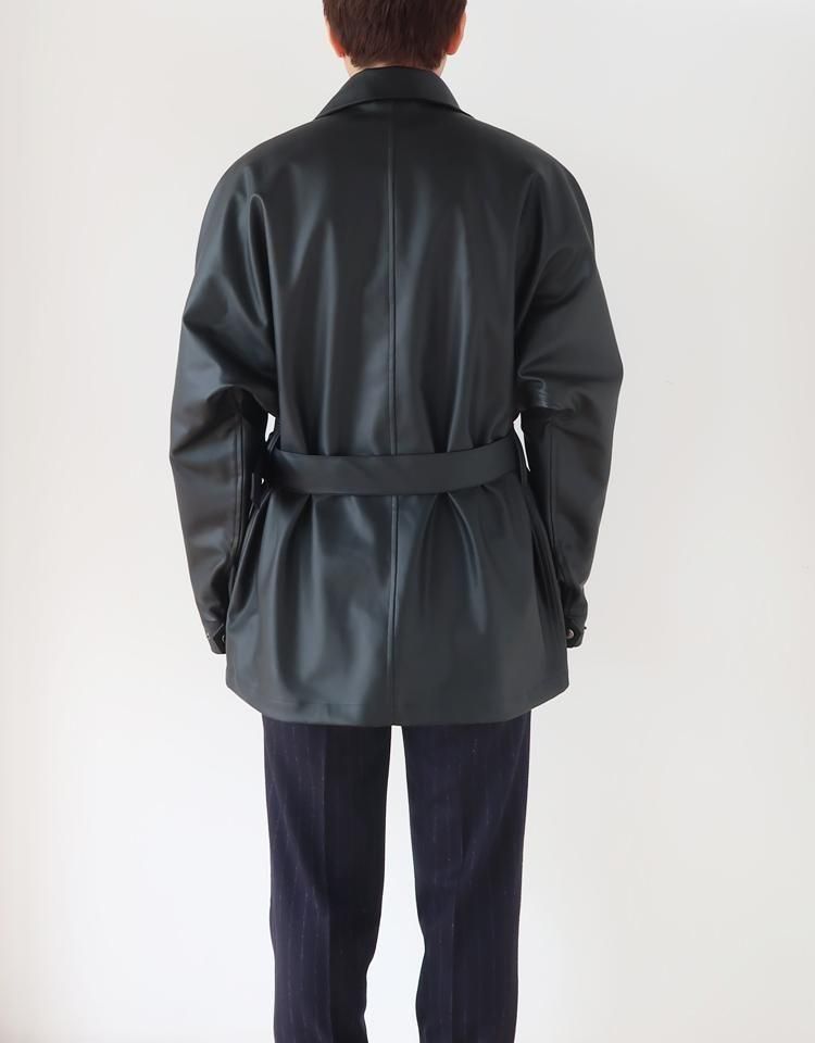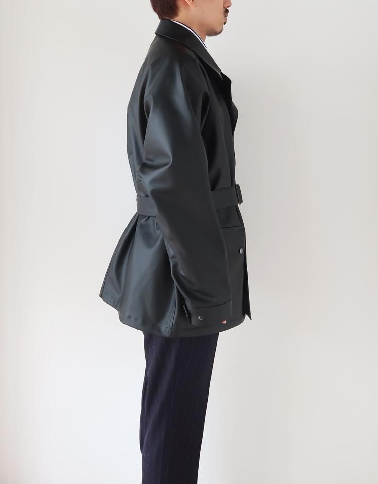 国内素材、⼩松マテーレのエクスクルーシブ素材ラバー⾒えのラミネート素材使⽤。1940年代のイギリスのモータサイクルブルゾンをインスピレーションにブルゾンを製作。