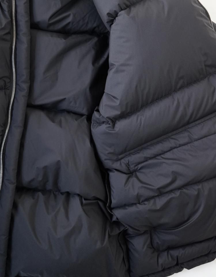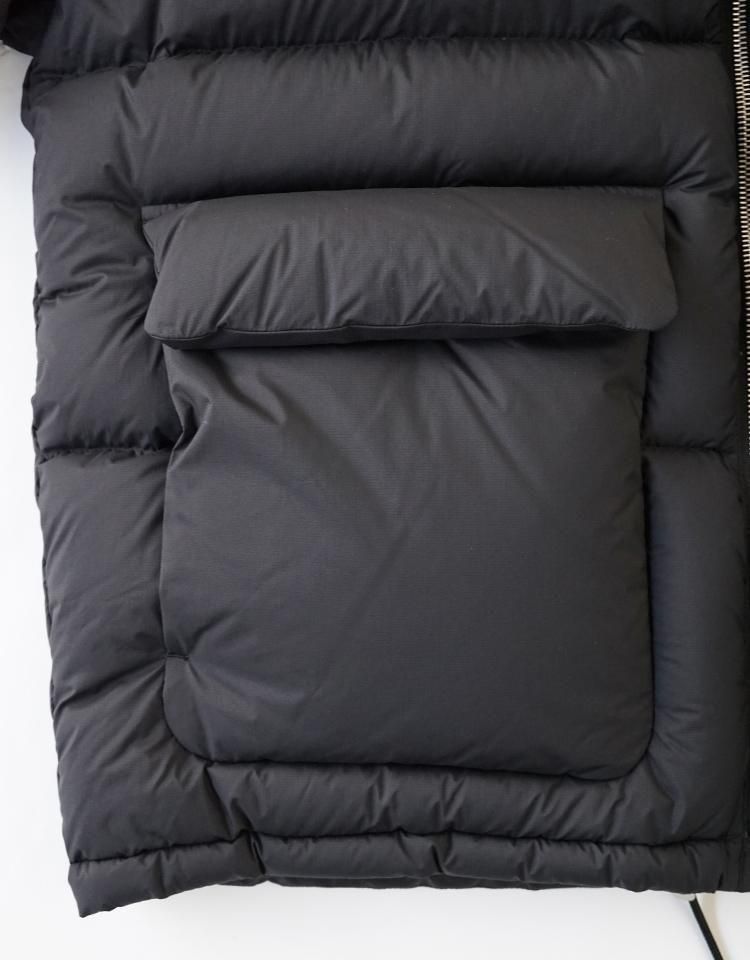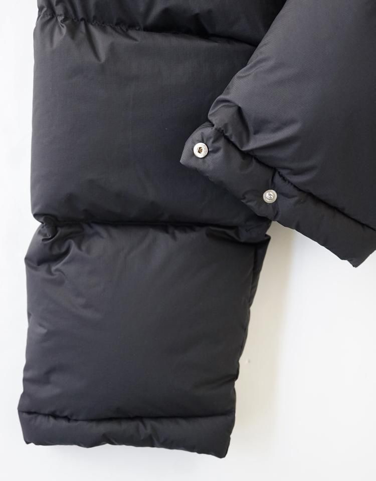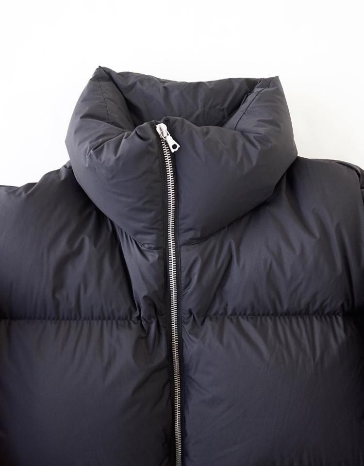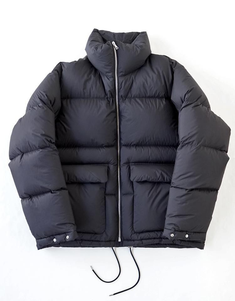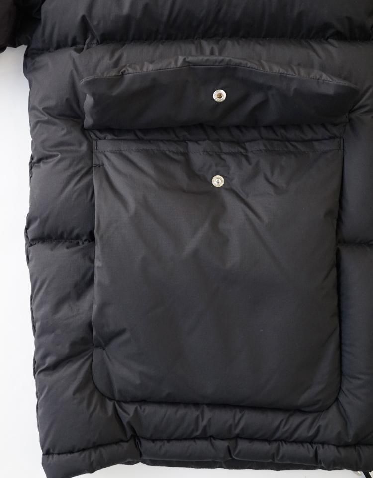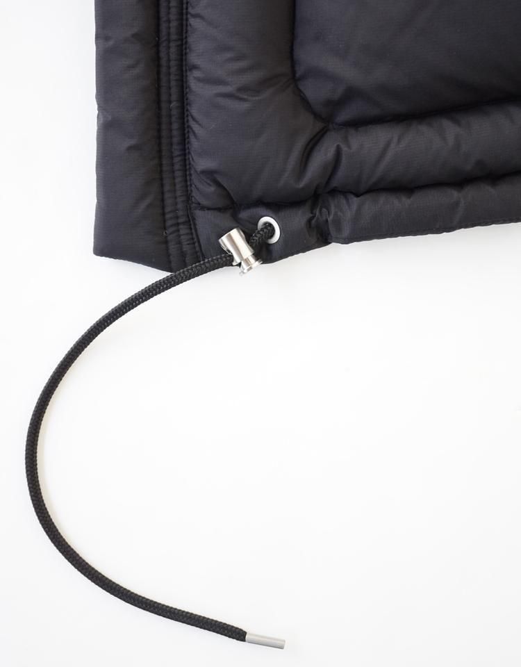 15dの極細ナイロンウーリー糸を使用した超軽量の極薄ミニリップストップ生地を採用し、裏面に特殊なウレタンコーティングを施すことで、防風性と撥水性を兼ね備え、機能性にも優れた素材となりました。中わたには英国産のホワイトダックダウンを使用し、製品に詰める前に再度加湿乾燥加工を加え、より軽くふっくらとした仕上がりにしています。この素材はボリューム感がありながらも軽量で、暖かさを保つ特徴があります。