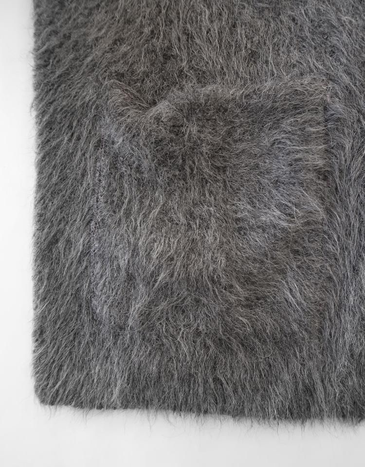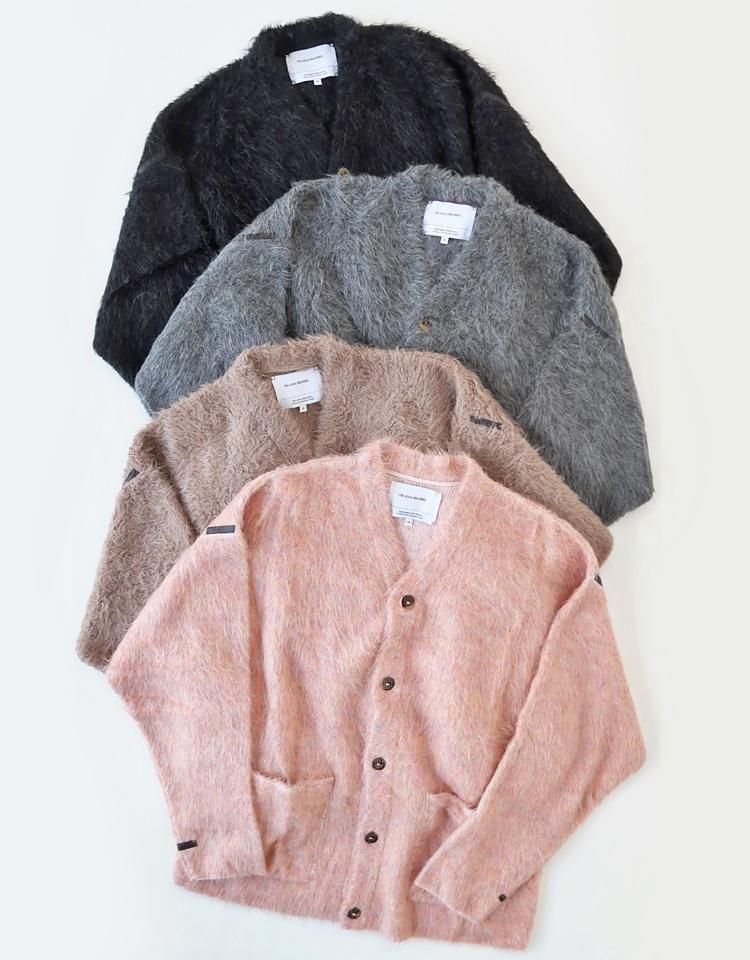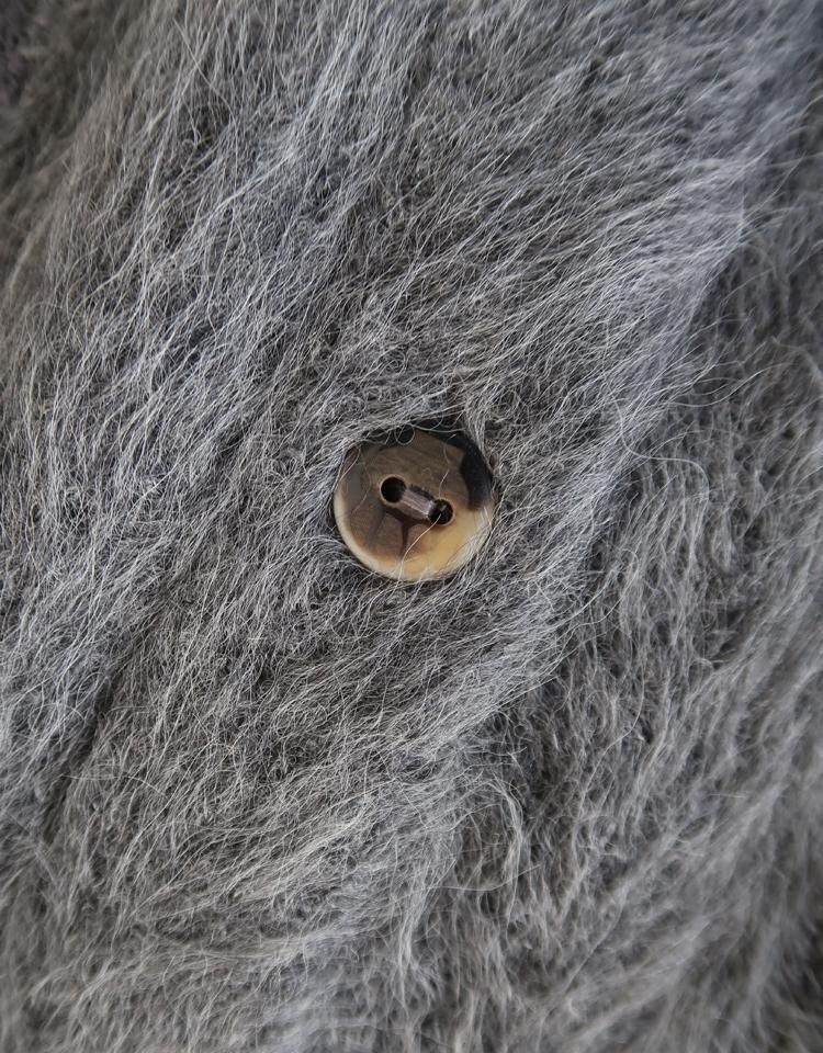 毛足の長いスリアルパカを使用したこのニットウェアはザイノウエブラザーズのオリジナル製品で、少しゆったりとしたフィット感のカーディガンは最も人気なものの一つです。外側の毛皮のような質感を生み出すデザインはシルクのようなスリアルパカ繊維の超長毛という特徴を活かした糸を開発したことで実現していて、袖口とウエストの縁をリブ無しで仕上げることで、スリアルパカ繊維の質感を細部にまで表現しています。両肩と袖口にはブランドアイコンでもある補強用のショルダーパッチが施されています。